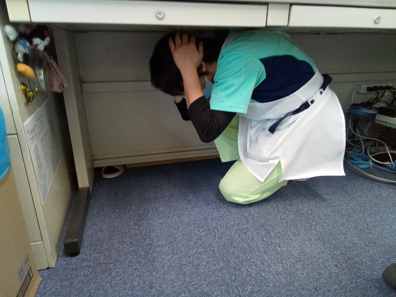 安全確保行動とは「まず低く」「頭を守り」「動かない」揺れが収まるまでじっとします。
